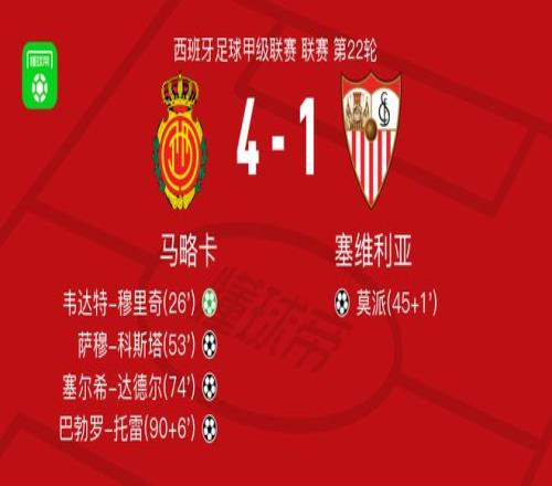 ±±¾©Ê±¼ä2ÔÂ3ÈÕÎ÷°àÑÀ×ãÇò¼×¼¶ÁªÈü ÁªÈü µÚ22ÂÖ£¬ÂíÂÔ¿¨Ö÷³¡¶ÔÕóÈûάÀûÑÇ ¡£ÂíÂÔ¿¨Î¤´ïÌØ-ÄÂÀïÆæÆÆÃÅ£¬ÈøÄÂ-¿ÆË¹ËþÆÆÃÅ£¬Èû¶ûÏ£-´ïµÂ¶ûÆÆÃÅ£¬°Í²ªÂÞ-ÍÐÀׯÆÃÅ ¡£ÈûάÀûÑÇĪÅÉÆÆÃÅ ¡£×îÖձȷÖÂíÂÔ¿¨ 4-1 ÈûάÀûÑÇ ¡£