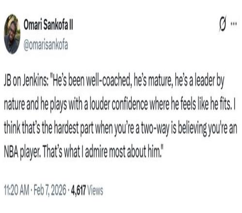 Èüºó»îÈûÖ÷˧±È¿Ë˹Ëþ·òÔÞÃÀµ½£º¡°Ëû½ÓÊܹýÁ¼ºÃµÄѵÁ·£¬ºÜ³ÉÊ죬ÌìÉú¾ß±¸Áìµ¼ÄÜÁ¦£¬Èç½ñËûÒ²ÕÒµ½Á˺ÏÊʵĽÇÉ«¶¨Î»£¬ÈÃËûÔÚ³¡ÉϱäµÃÔ½·¢×ÔÐÅ£¬ÒªÖªµÀ¹ØÓÚË«ÏòÌõÔ¼ÇòÔ±À´Ëµ£¬¼áÐÅ×Ô¼ºÄÜÁ¢×ãNBAÊÇ×îÄѵģ¬ÕâÒ»µãǡǡÊÇÎÒ×îÐÀÉÍËûµÄµØ·½¡£¡±