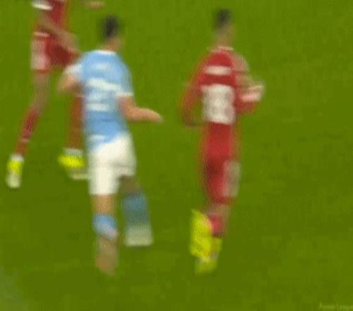 从慢镜头来看,格伊简直伸手拉住了萨拉赫的球衣,但格伊伸手拉人时是在禁区外,主裁判判罚禁区外任意球并且向格伊出示黄牌是正确判罚 。