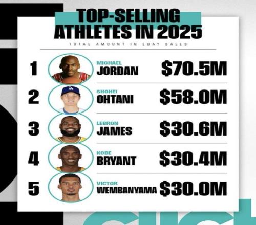 最近eBay宣布了“2025年eBay销售总额最高的运发动”榜单,乔丹、詹姆斯、科比等人都在榜上,大谷翔平也挤进了前二。更夸张的是,科比离开赛场已经多年,2025年相关商品在平台上依然能卖到3040万美元,这股购置力究竟从哪来?同一份榜单里,62岁的乔丹还能稳坐第一,21岁的文班亚马又已经冲到第五,这种“跨代同框”的排名,谁的位置最让人意外?(数据截至2025年)