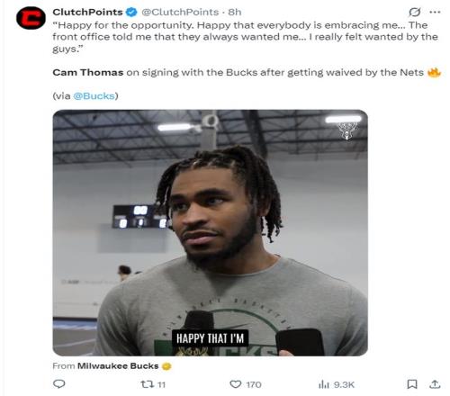 托马斯在签约雄鹿后接受采访 ,他说道:很兴奋能有这个时机加盟雄鹿 ,也很兴奋各人接纳了我 ,球队治理层告诉我 ,他们一直都希望我能加入 ,我能感受到队友们的认可。