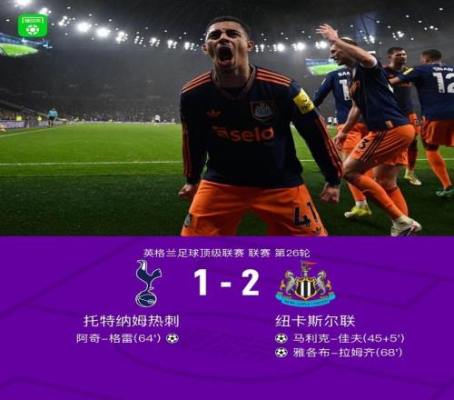 北京时间2月11日英格兰足球顶级联赛 联赛 第26轮,托特纳姆热刺主场对阵纽卡斯尔联。上半场,佳夫门前补射突破僵局。下半场,萨尔头球摆渡,阿奇-格雷扳平比分。安东尼-戈登助攻,拉姆齐破门。全场角逐结束,热刺1-2不敌纽卡,遭遇英超联赛连续8轮不堪。
