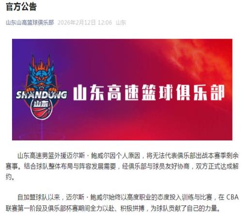 山东男篮外援鲍威尔因个人原因,将无法代表俱乐部出战本赛季剩余赛事。结合球队整体结构与阵容生长需要,经俱乐部与球员友好协商,双朴直式告竣解约。