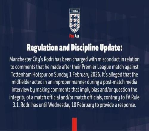 ÂÞµÂÀïÒòÔÚ2026Äê2ÔÂ1ÈÕÓëÈȴ̵ÄÓ¢³¬½ÇÖðºóÐû²¼µÄÑÔÂÛ¶ø±»Ö¸¿ØÐÐΪ²»µ±£¬¾Ý³Æ£¬ËûÔÚÈüºóýÌå²É·ÃÖÐÐû²¼ÁËÌåÏÖÆ«¼ûºÍ/»òÖÊÒɽÇÖð¹ÙÔ±ºÍ/»ò½ÇÖð¹ÙÔ±¹«ÕýÐÔµÄÑÔÂÛ£¬ÕâÎ¥·´ÁËÓ¢×ã×ܹæÔò3.1£¬ÂÞµÂÀïÐèÔÚ2ÔÂ18ÈÕ֮ǰ×÷³ö»ØÓ¦¡££¨Í¨¸æÍ꣩