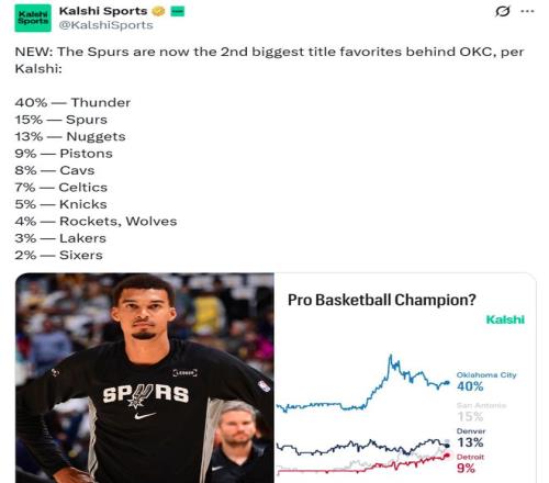 在通例赛进入冲刺阶段,预测平台Kalshi Sports更新NBA本季夺冠概率,其中火箭4%并列第八,湖人3%勇士落选,榜首40%断档领先。