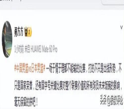 赛前,北京记者勇方方发文点评:“中国男篮vs日本男篮,一场于情于理都不可输的角逐,打的不可是出线形势,不可是国家荣誉,另有国字号要害角逐对整个联赛价值和所有球员未来饭碗的影响,毫无保存的拼吧! ”