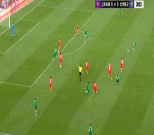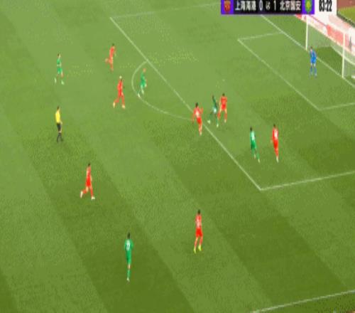 上半场第29分钟,海港右路传中制造国安禁区内杂乱,皮球频频反弹后打中国安门柱。