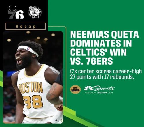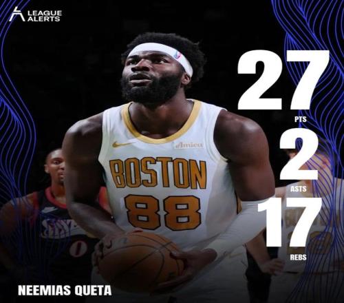 这场角逐,凯尔特人的中锋内米亚斯克塔打出了生涯最强的一场角逐:全场出战27分钟,投篮14中10,罚球10中7,拿下27分17篮板2助攻3盖帽,正负值+20。