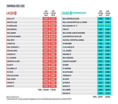 西甲官方更新人为帽:巴萨从3.51亿欧元提高到4.328亿欧