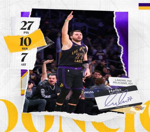 东契奇此役再度创立纪录,在2026年东契奇20次20+5+5联盟第一,单赛季14次拿到25+10+5是湖人队史2001年奥尼此后首人。
