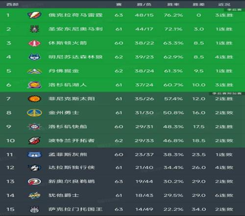 北京时间3月4日,随着湖人110-101鹈鹕、太阳114-103国王的角逐结束,今天的NBA通例赛结束了所有角逐,我们看看西部最新排名!