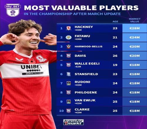 北京时间3月5日,在更新了英冠球员的身价之后,德转统计出了此次更新之后英冠身价最高的10名球员,米德尔斯堡中场哈克尼2800万欧元排名第一,莱斯特城边锋法塔武2400万欧元第二。