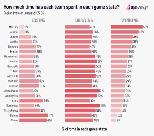 同时,这也是阿森纳本赛季联赛里最长的一次单场拖延时长。他们本场的拖延时间占总角逐时长的30.6%,在2025-26赛季所有英超球队中排名第11。