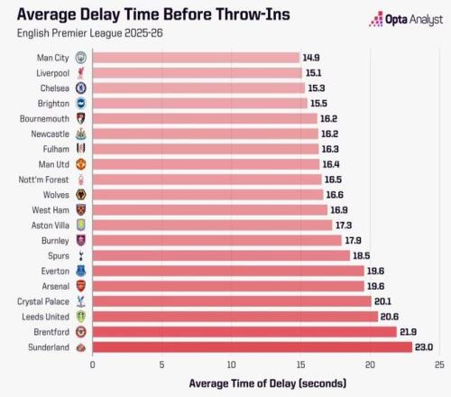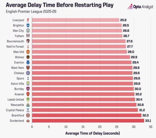 阿森纳59次的拖延次数,显然和1851秒的总拖延时长直接相关。平均下来,他们每次从角球、球门球、界外球和任意球重新开球,需要耗时31.4秒。而在2025-26赛季英超中,共有195次球队重新开球的平均用时凌驾这一数字。