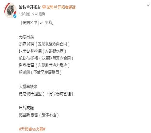 ±±¾©Ê±¼ä3ÔÂ6ÈÕ£¬¿ªÍØÕß¹ÙÐû3ÔÂ7Èտͳ¡¶ÔÕó»ð¼ýµÄÉ˲¡±¨¸æ£¬Ñîå«ÉÏ·ÅÉú³¤ÁªÃËȱϯ£¬½¹µã°¢·òµÏÑÇϱ³²¿É˲¡ÖÎÀíС¸ÅÂʳöÕ½£¬ÄÂÀ×ÒòΪÉú²¡³öÕ½³ÉÒÉ¡£±¾Èü¼¾Ç°Èý´Î½»·æ£¬¿ªÍØÕß2ʤ1¸ºÁ¦Ñ¹»ð¼ý´¦ÓÚÉÏ·ç¡£