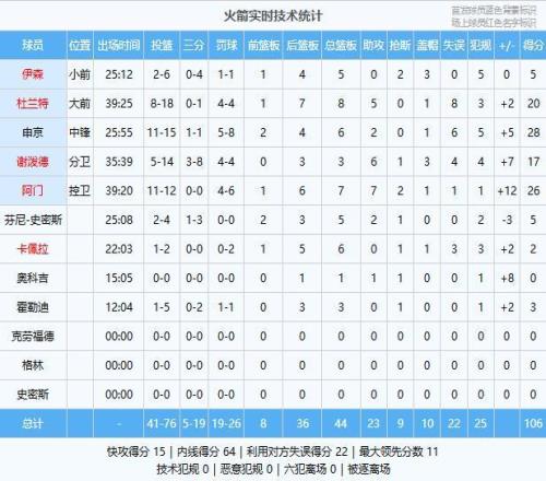 ϰ볡˫·½¿ªÆôÀ¾âÕ½£¬Ë«·½Ç°ÆÚ¶à´Î½»»»ÁìÏÈÄÑ·Ö¸ßÏ£¬ºó°ë¶Î¿ªÍØÕßÉÔʤһ³ïÈ¡µÃ΢ÈõÓÅÊÆÒ»Â·ÁìÅÜ£»²»¹ýÄ©½Ú»ð¼ý×ÜËãÕÒ»Ø×´Ì¬£¬ËûÃǺä³öÒ»²¨23-5µÄ¹¥ÊÆÖ±½ÓŤת¾ÖÊÆ²¢½¨Á¢ÆðÁ½Î»ÊýÁìÏȵÓڨʤ¾Ö£¬¿ªÍØÕßËäÈ»ÔÚËæºóֹѪ׷ÖÁ5·Öµ«ÎªÊ±ÒÑÍí¡£×îÖÕ£¬»ð¼ýÖ÷³¡106-99Íê³ÉÁ½Î»Êý´óÄæ×ª»÷ÍË¿ªÍØÕßÄÃϽÇÖðÖÆÖ¹Á¬°Ü¡£
