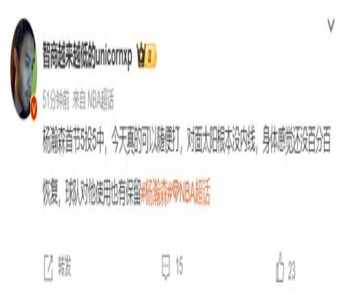 正如欧洲篮球专家王健所说,杨瀚森首节5中5可以随便打,因为太阳基础没内线,杨瀚森在身体还没有百分百恢复的情况下打得很是轻松,球队对杨瀚森的使用也有所保存。
