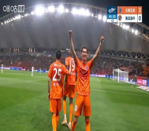 另外一场角逐中,云南玉昆坐镇主场迎战青岛海牛。上半场第13分钟,杨梓豪助攻克莱伯攻入加盟首球,云南玉昆1-0突破僵局。仅3分钟之后,弋腾头球冲顶破门扩大比分。补时阶段侯永永单刀打门再度到手,云南玉昆半场3-0领先。