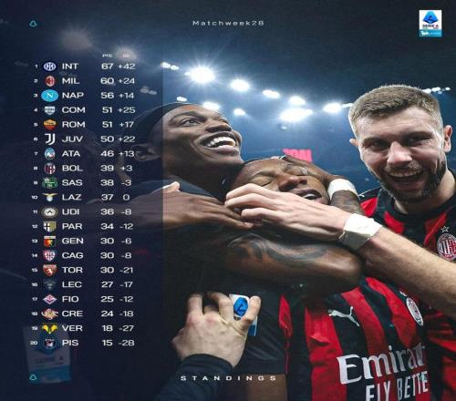 意甲第28轮综述:米兰笑傲德比仍落后国米7分 ,科莫升第四